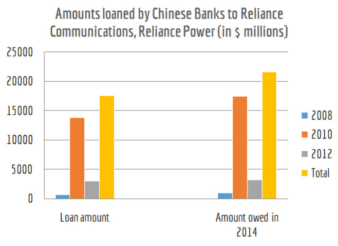 चीनी बैंकों ने अनिल अंबानी की रिलायंस टेलीकॉम और बिजली कम्पनियों को 18 बिलियन डॉलर से अधिक का ऋण दिया। यह चीनी उपकरणों को खरीदने के लिए था