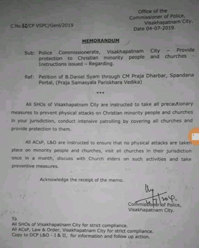 आंध्र प्रशासन ईसाई मिशनरियों के साथ काम में हाथ बँटाता दिख रहा है। विशाखापत्तनम के पुलिस आयुक्त राजीव कुमार मीणा ने अल्पसंख्यक ईसाइयों और उनके चर्चों को हिंदू आक्रामकता से बचाने के लिए शहर की पुलिस को एक ज्ञापन जारी किया। विजाग शहर की पुलिस वेबसाइट के अनुसार, आयुक्त ने 27 जून 2019 को कार्यभार संभाला और यह ज्ञापन 4 जुलाई 2019 को जारी किया गया। आयुक्त ने ईसाइयों की सुरक्षा के लिए आदेश जारी करने में कोई समय बर्बाद नहीं किया। जिस व्यक्ति ने सुरक्षा का अनुरोध किया है, उसका आंध्र के ईसाई मुख्यमंत्री वाईएस जगनमोहन रेड्डी के साथ घनिष्ठ संबंध है।