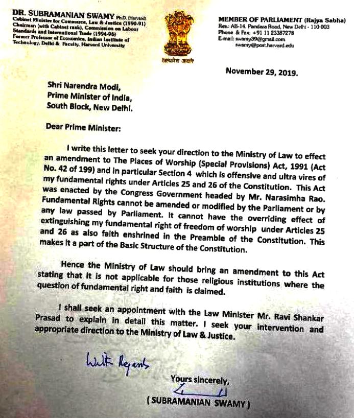 सुब्रमण्यम स्वामी द्वारा प्रधानमंत्री को पूजा स्थल अधिनियम 1991 में संशोधन लाने के लिए लिखा गया पत्र नीचे प्रकाशित किया गया है: